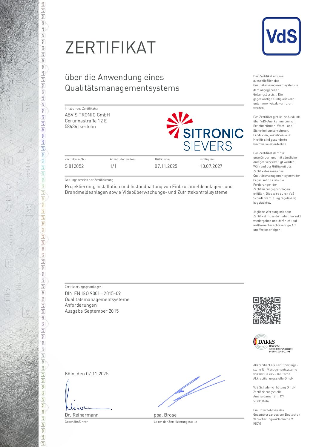 Nachweis über das zertifizierte QMS der ABV SITRONIC GmbH, Iserlohn
